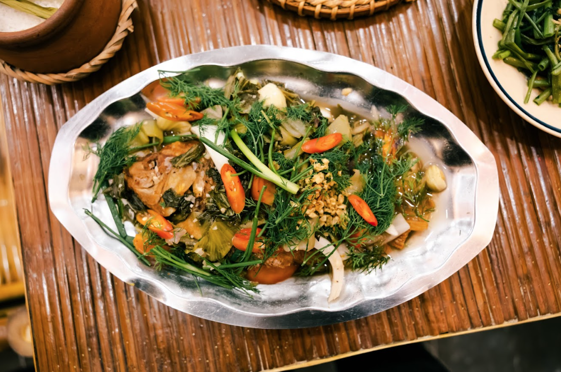 Sự hòa quyện của cơm trắng dẻo thơm, canh nóng thanh ngọt, rau xanh và cá tươi tạo nên một bữa ăn đậm đà, ấm bụng và đầy yêu thương.